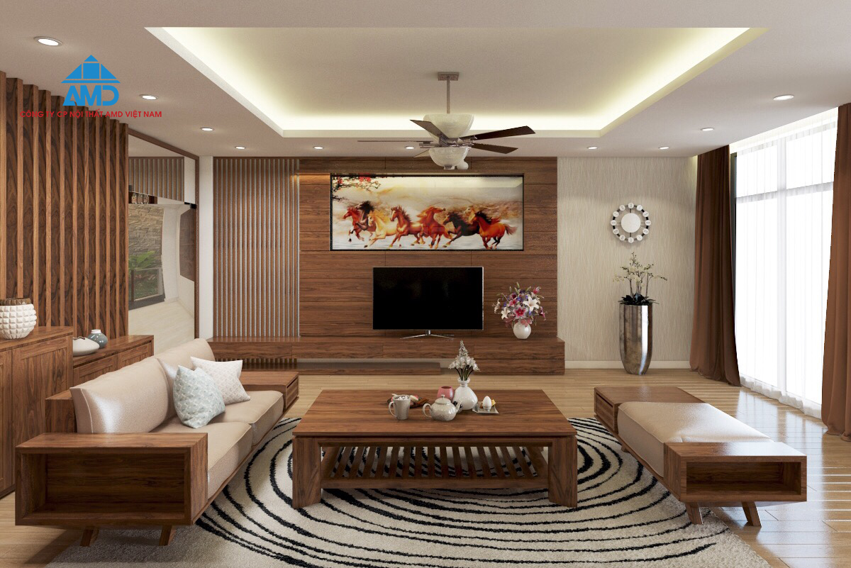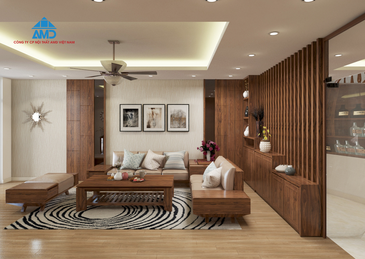 – Gỗ óc chó nhập khẩu với màu sắc đẹp và đặc trưng kết hợp hài hòa với nội thất xung quanh phòng khách.