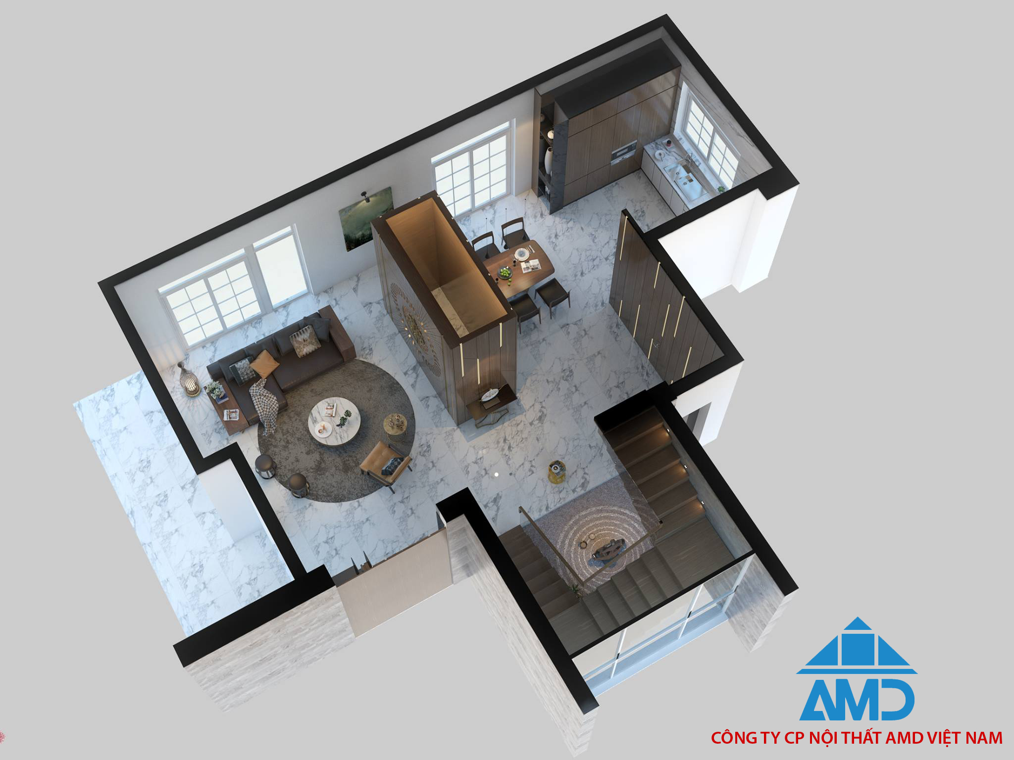 Căn biệt thự có mặt bằng rộng nhưng không được vuông vức cho lắm, với những đường cắt xẻ rất sâu khiến cho các KTS của chúng tôi khá đau đầu trong việc tìm ra giải pháp để bố trí sao cho hợp lí nhất. Chúng tôi đưa ra giải pháp mang tên: Thi công theo phong cách tối giản với gỗ óc chó, lấy vật liệu này làm chủ đạo cho toàn bộ căn biệt thự hai tầng.