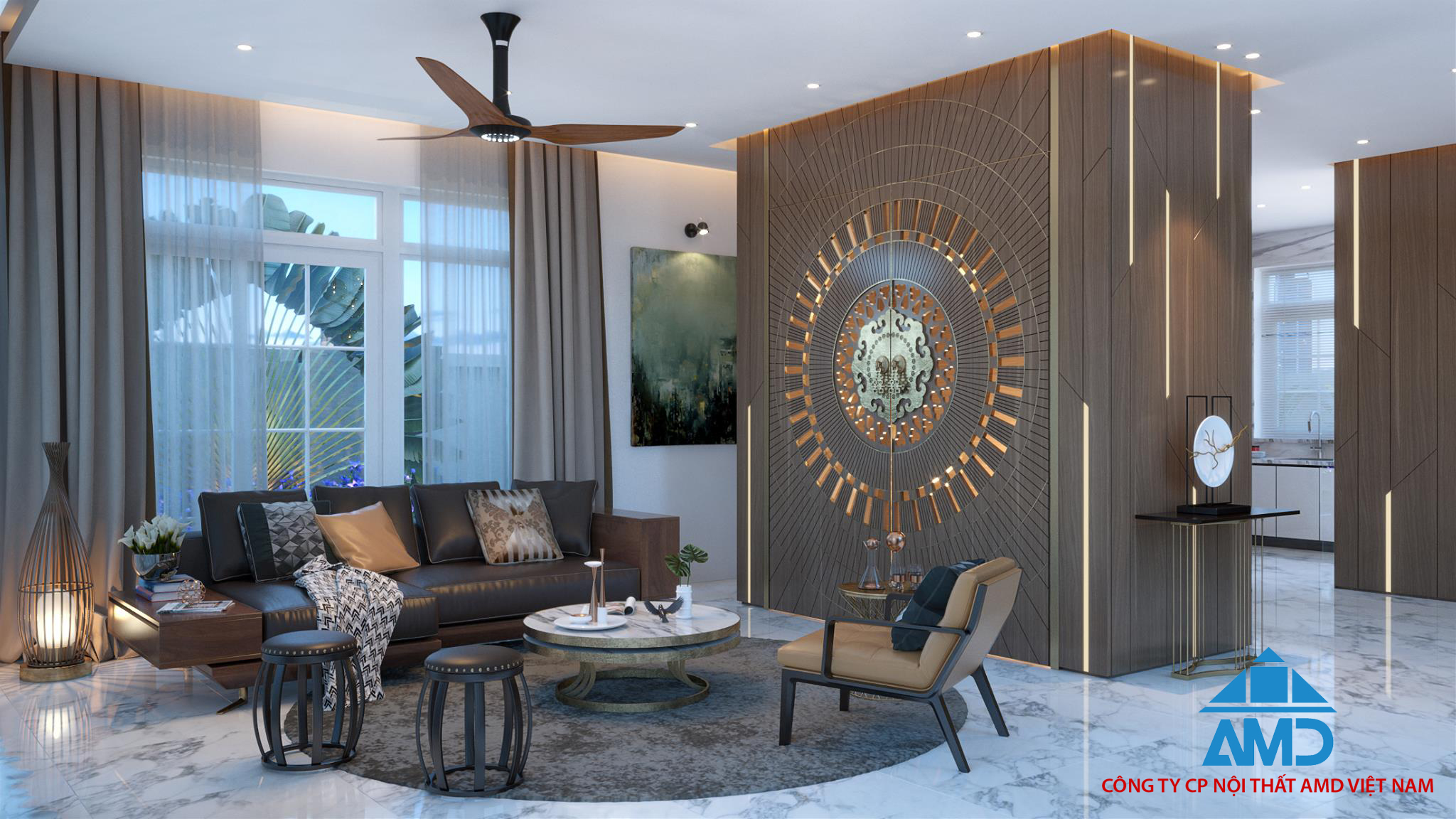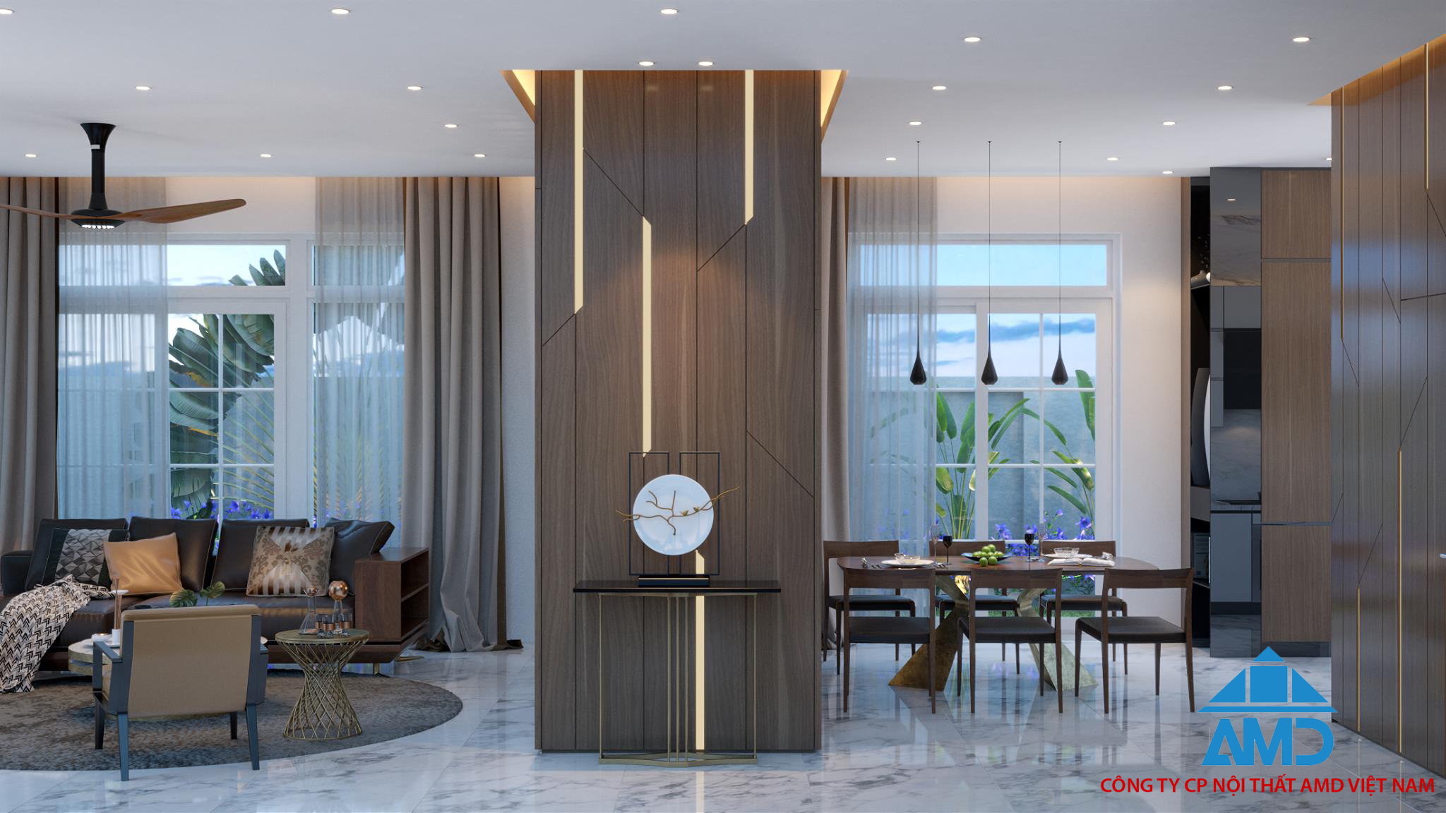 Phòng sinh hoạt chung được thiết kế liên thông với bản lề là vách trang trí ấn tượng