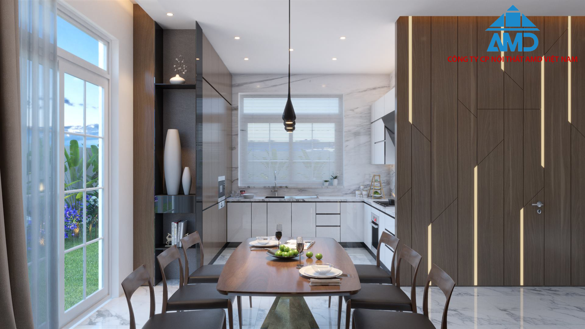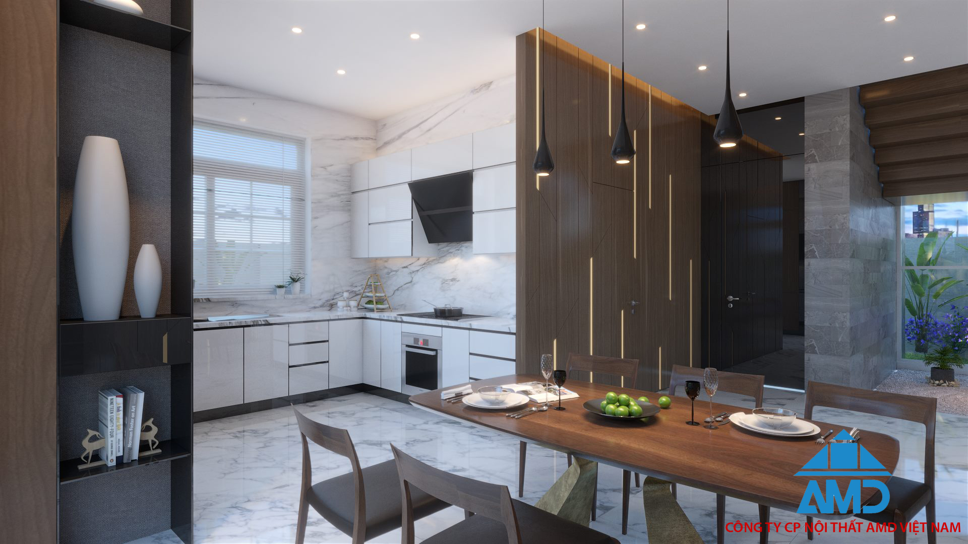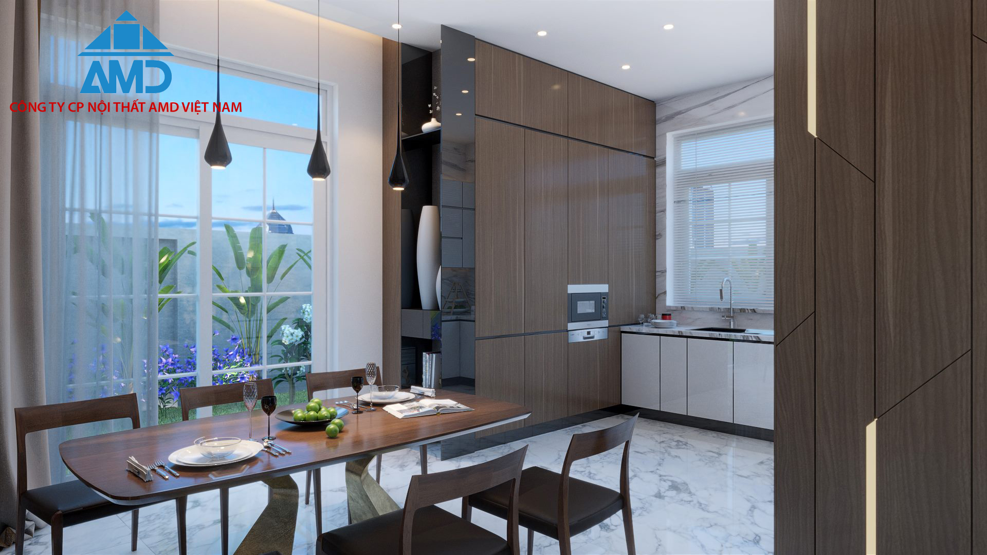 Phòng bếp là nơi thể hiện đậm nét tính chất hiện đại tối giản mà các KTS của Nội thất AMD đặt ra. Sự pha trộn của hai dòng vật liệu: gỗ óc chó tự nhiên & gỗ công nghiệp Acrylic mang đến vẻ đẹp vừa năng động, hiện đại vừa sang trọng, đẳng cấp, giúp cho bữa ăn của gia đình thêm trọn vẹn.