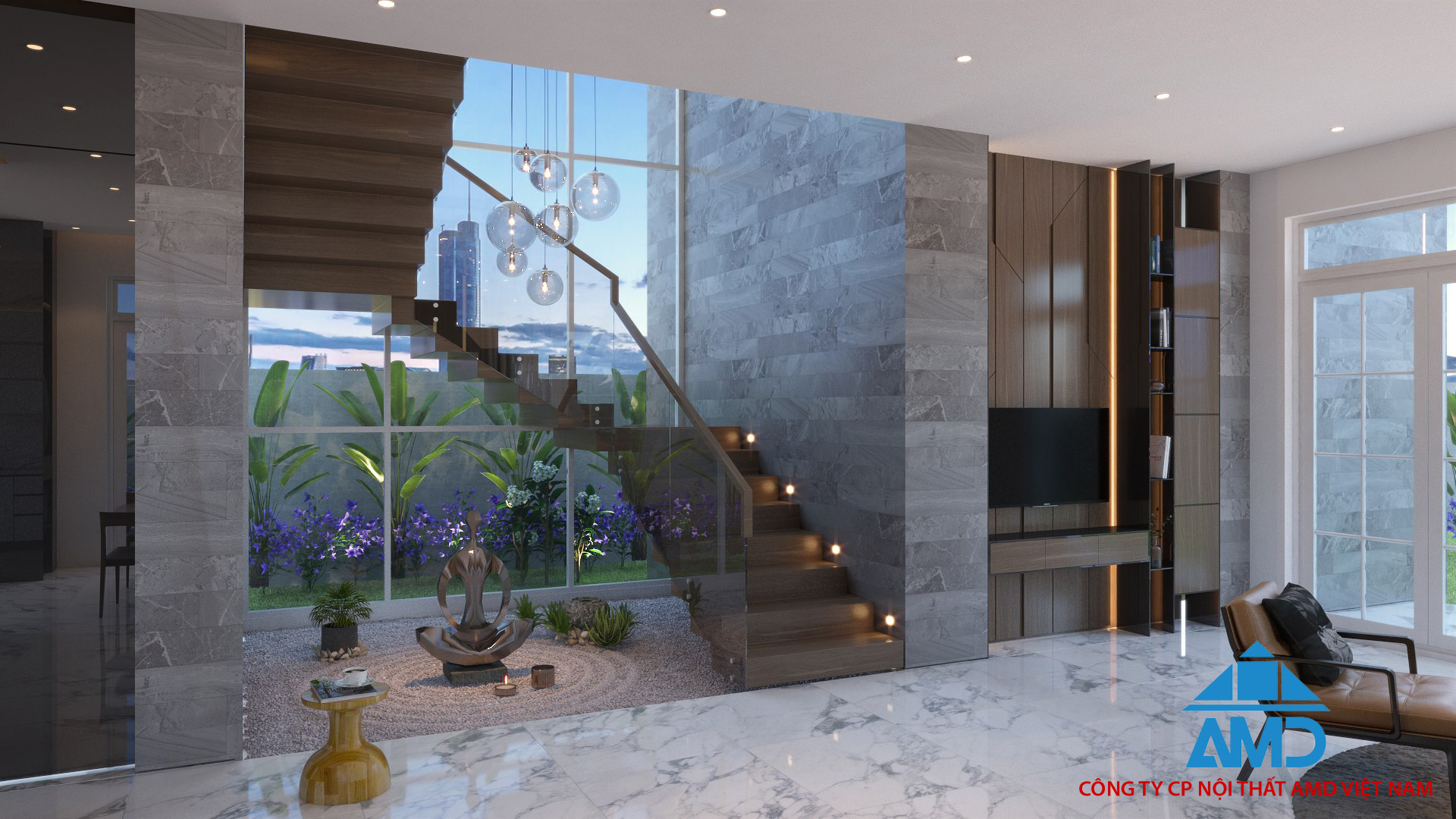 Gầm cầu thang được tận dụng để trang trí tiểu cảnh, phá vỡ sự nhàm chán của thiết kế biệt thự thông thường