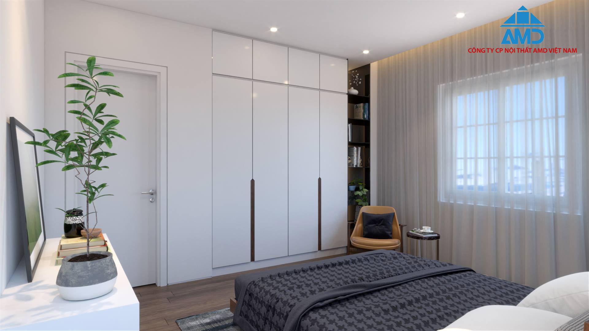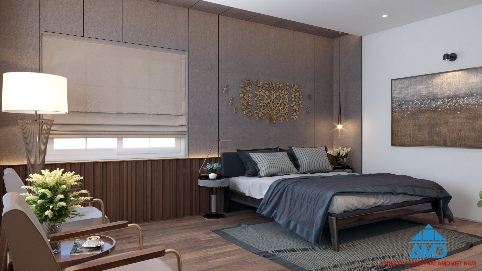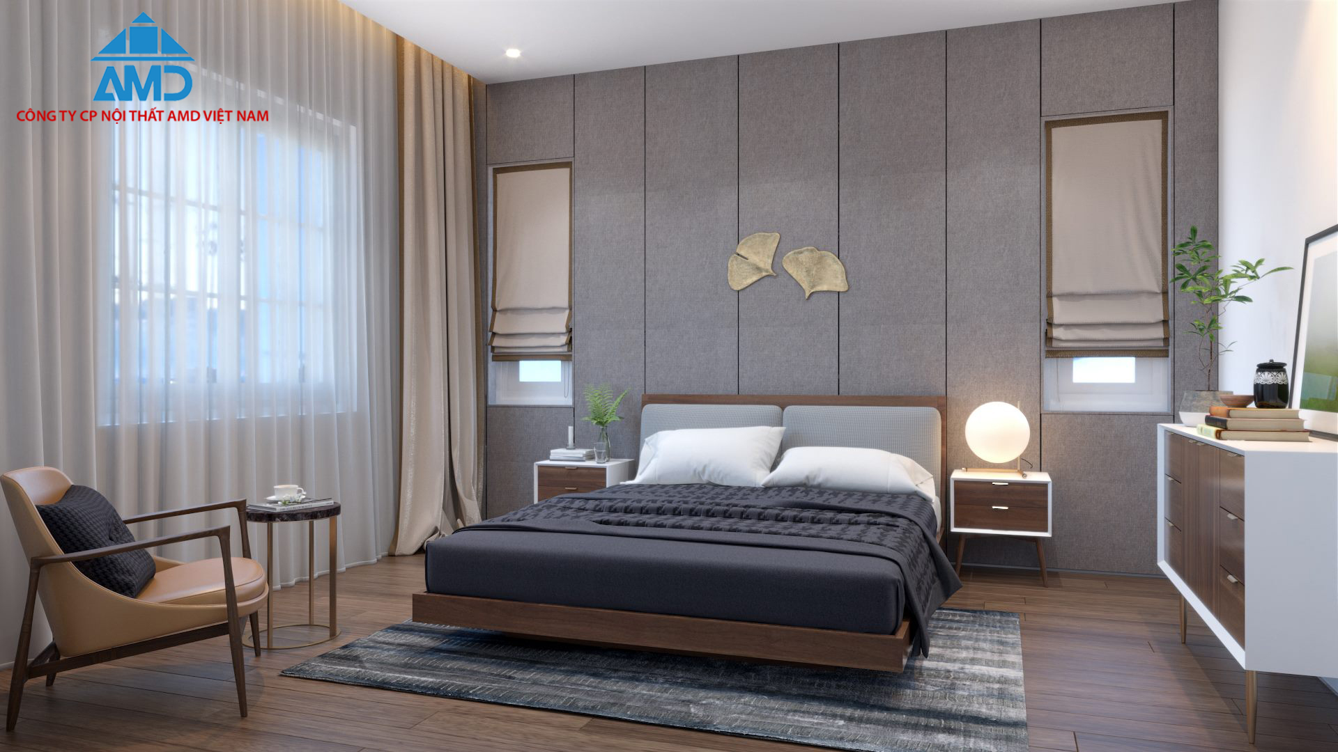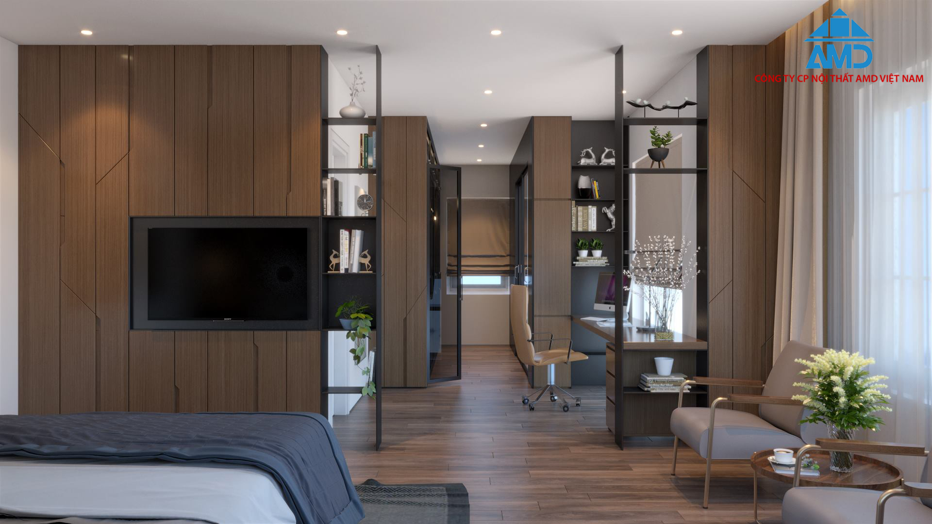 Phòng ngủ được thiết kế tối giản nhằm tôn lên giá trị của đồ nội thất gỗ óc chó. Phòng ngủ master của căn biệt thự tại Hải Dương này có diện tích khá lớn, do đó, KTS của NỘi thất AMD đã bố trí phòng làm việc ngay trong không gian nghỉ ngơi này. Chúng tôi đã phân chia lại các không gian để có các công năng độc lập nhất có thể. Phòng ngủ với tone màu trầm, ánh sáng vừa đủ, tối ưu cho giấc ngủ sâu và ngon hơn. Phòng làm việc có nhiều cửa sổ hơn, ánh sáng chan hòa và được bố trí hợp phong thủy với mệnh của người chồng.