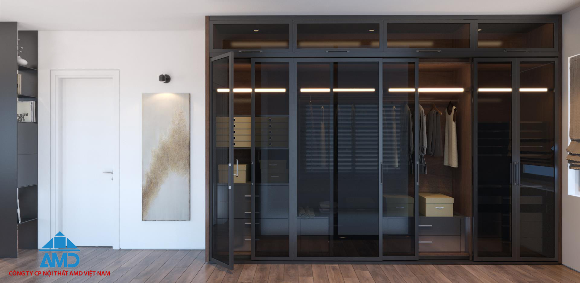 Tủ quần áo được thiết kế âm tường, không sử dụng gỗ mà dùng cánh kính mờ, bên trong gắn đèn LED để tạo sự cơi nới không gian và tăng phần sang trọng cho không gian nghỉ ngơi.